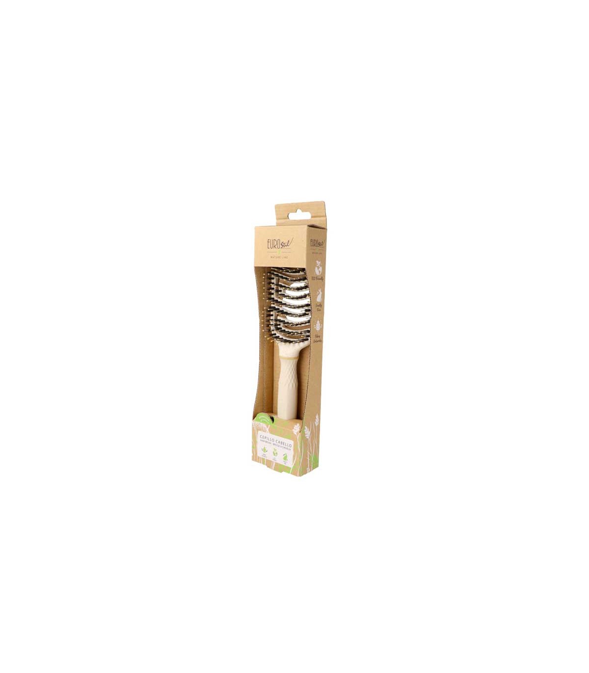 El Cepillo Profesional ECO Natura de Eurostil es la combinación perfecta entre tecnología y respeto por el medio ambiente. Su cuerpo flexible y cabezal de paja de trigo permiten un cepillado suave que se adapta al contorno de tu cabeza, evitando roturas y aportando un brillo natural gracias a su mezcla exclusiva de púas.